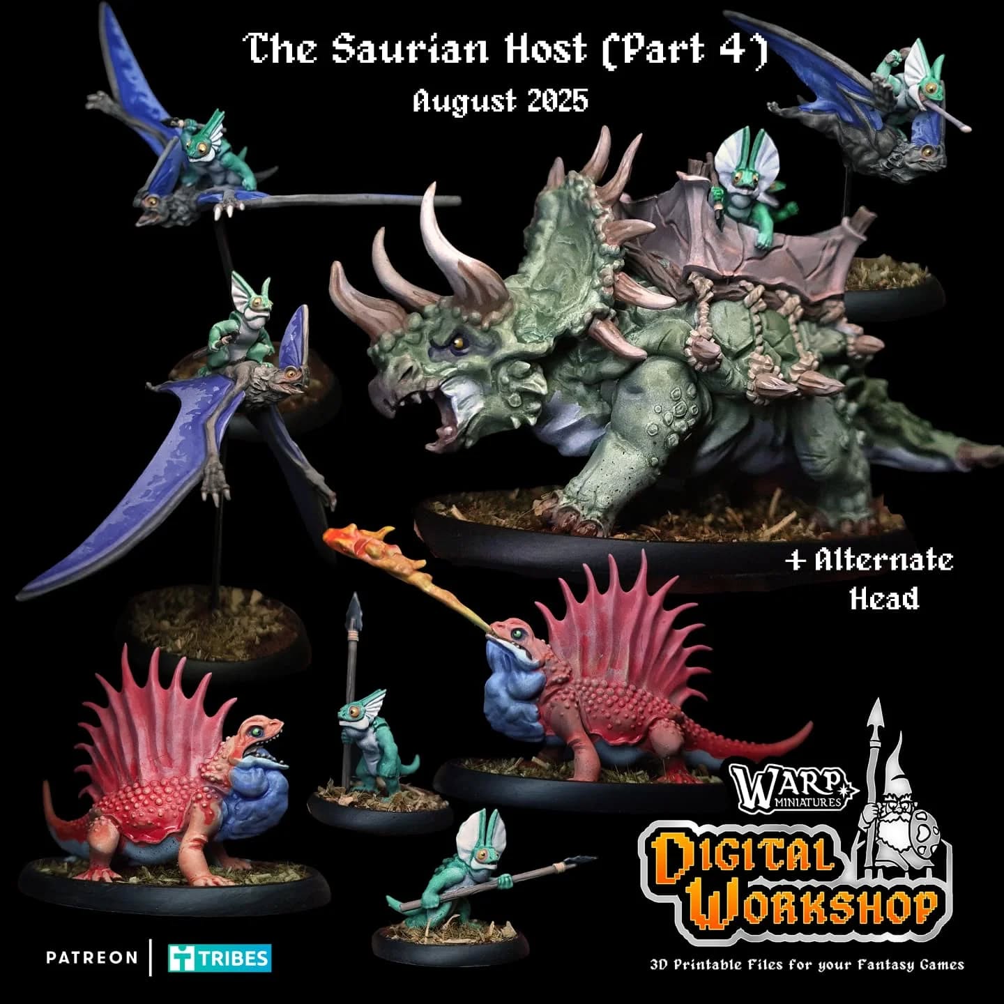 Warp Miniatures are back with even more Patreon offerings for those looking to fire up their 3D printers this month. The August pack introduces a new set of Dinosaur miniatures in 32mm scale for use in your 32mm scale Fantasy wargames!