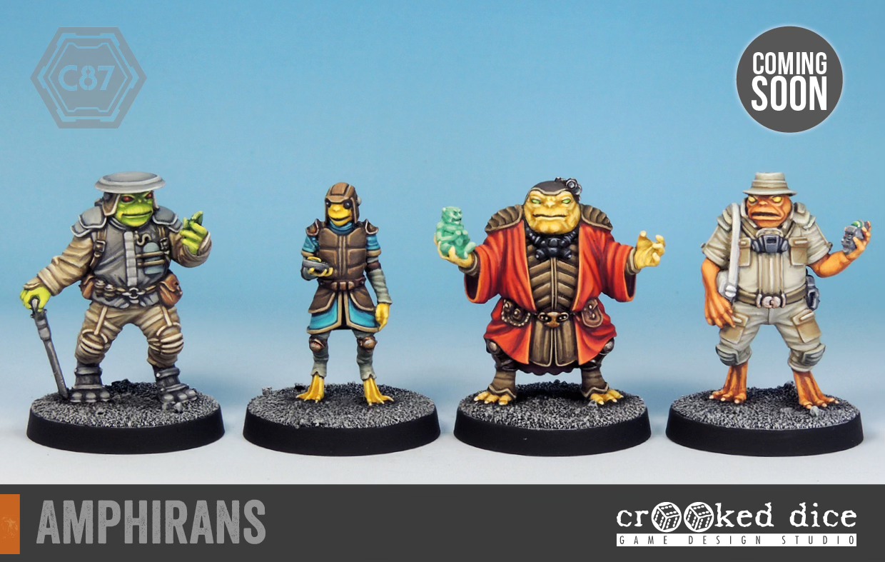 A lot of these sculpts have been building up behind the scenes over the last few years and now it's nearly time for them to be released onto painting tables and as part of your games. Here, we have an expansion to the Amphirans, who can then be used as part of the civilian space frogs that make their home within the world of Colony 87.