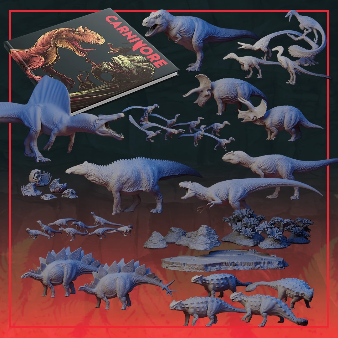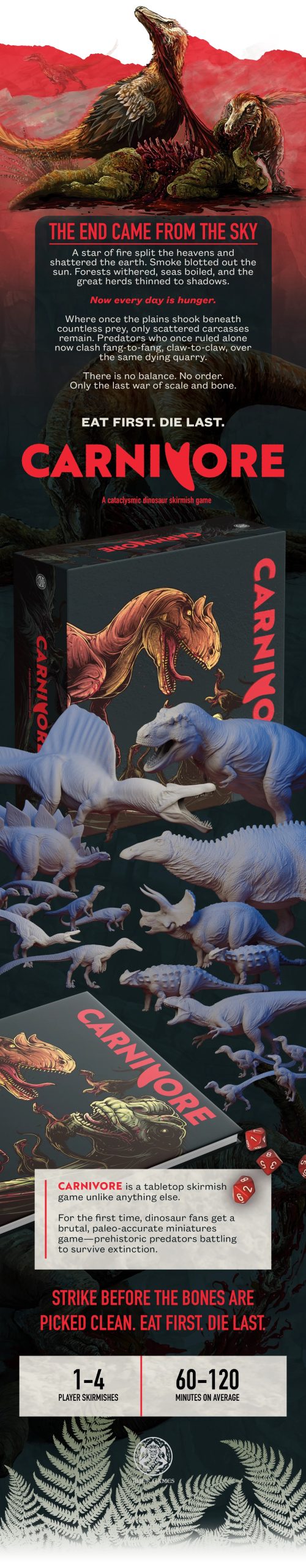 Carnivore is a game which can be played solo or with up to four players in skirmishes on the tabletop that take around sixty to 120 minutes to play. There are no humans here; this is a prehistoric landscape in the wake of the meteor that struck the Earth. As dinosaurs fight for survival, they must battle against each other to "eat first and die last".