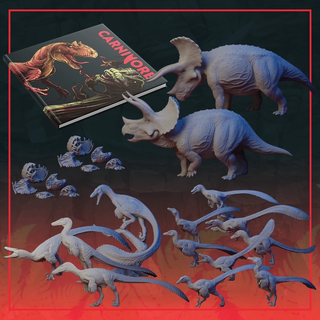 There are various pledge levels for you to dive into, which give you access to both carnivores and herbivores. All of the miniatures are around 32mm scale but the game has been made purposefully miniatures-agnostic, so you can play at any scale and just adjust your measurements accordingly.